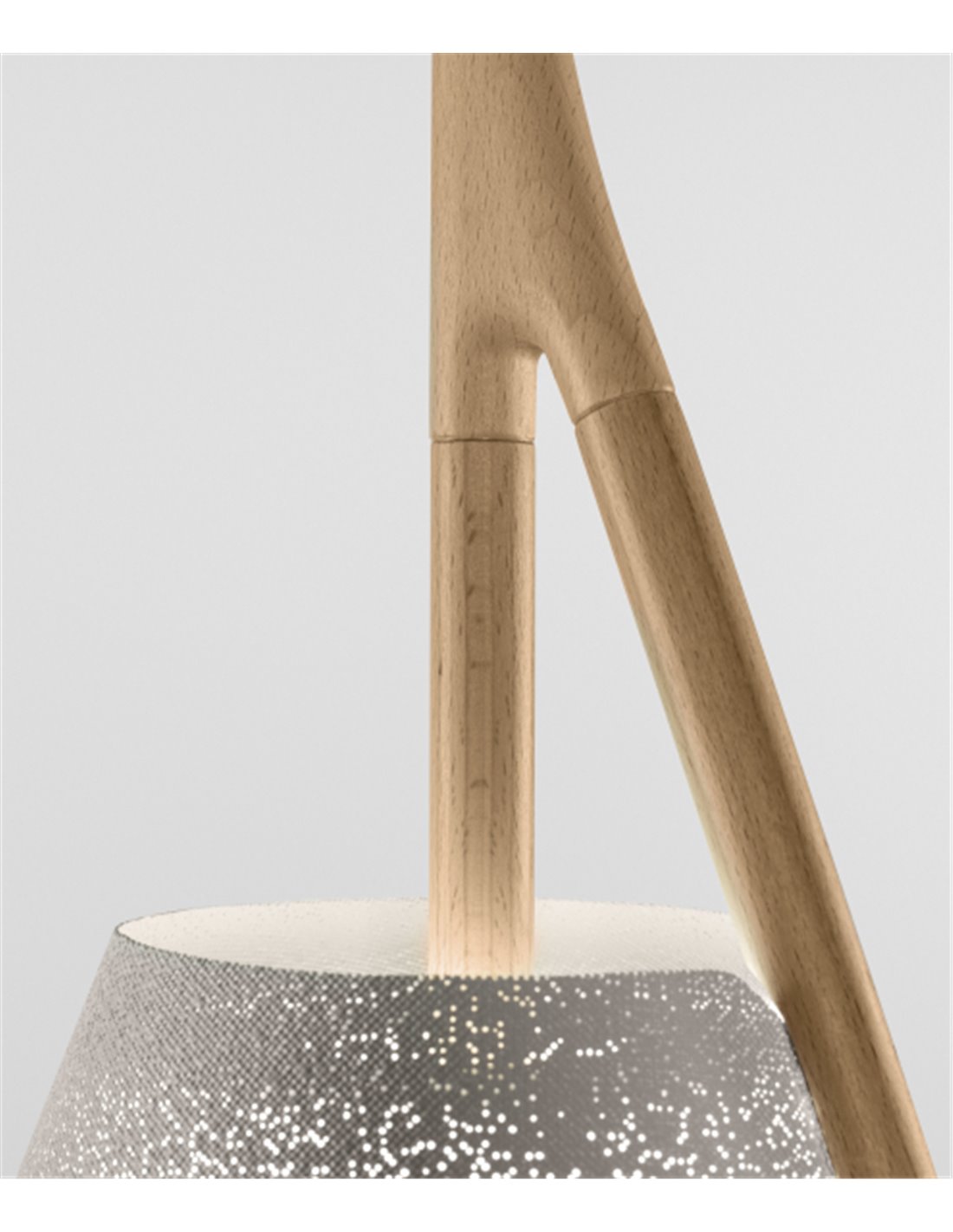 Cambo se compone de una estructura de madera de haya con barniz y una pantalla de acero pintada en blanco o negro, dos colores que resaltan la calidez de la madera. La tulipa alberga la fuente de luz LED integrada.