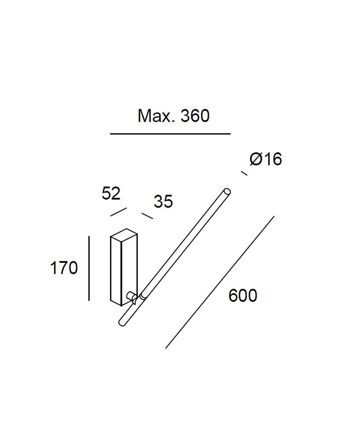 In terms of dimensions, the wall bracket is 17 cm high, 5.2 cm wide and 3.5 cm long. The rod has a length of 60 cm and a diameter of 1.6 cm, reaching a total length of 36 cm when adjusted.