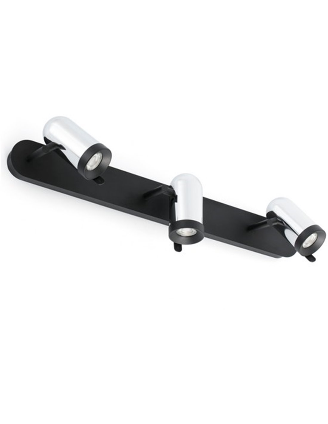 The Orleans light in its linear version with three adjustable spotlights is made of steel and allows you to choose between two finishes: all black or black structure with chrome spotlights.
