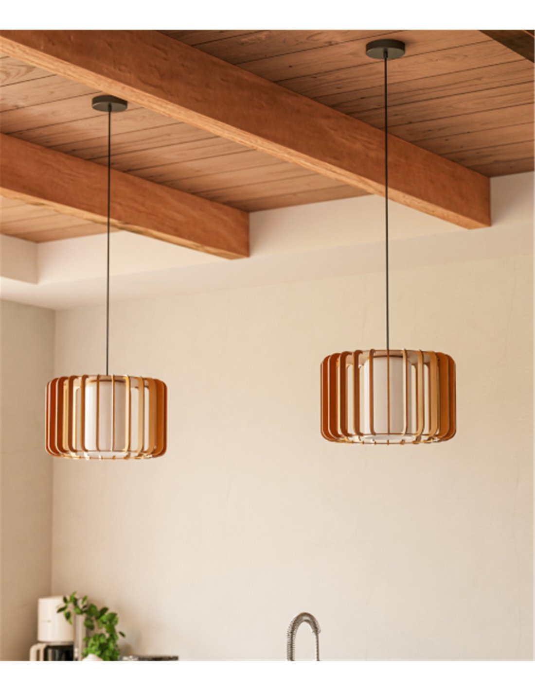 The Viva pendant light offers us a handcrafted touch, thanks to its structure, made of FSC-certified light wood from recycled materials. It stands out thanks to a lattice of slats that surrounds an interior textile diffuser, softening the light to create a warm and cosy atmosphere.
