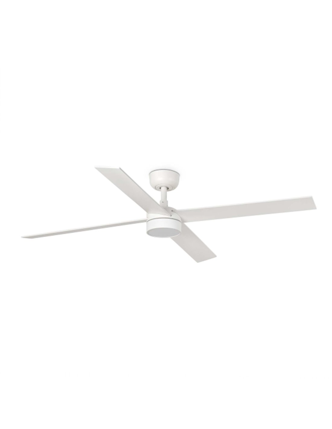 The most striking feature is its four reversible blades made of plywood, which allow you to alternate between matte white and ash finish, offering two colors in a single product. The body is made of steel in matte white and is accompanied by an opal white light diffuser.