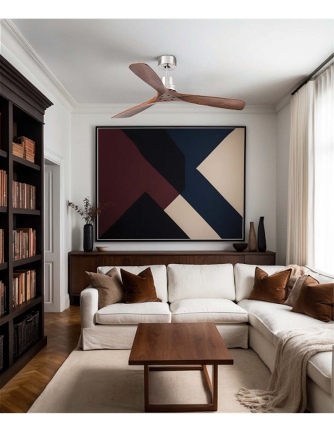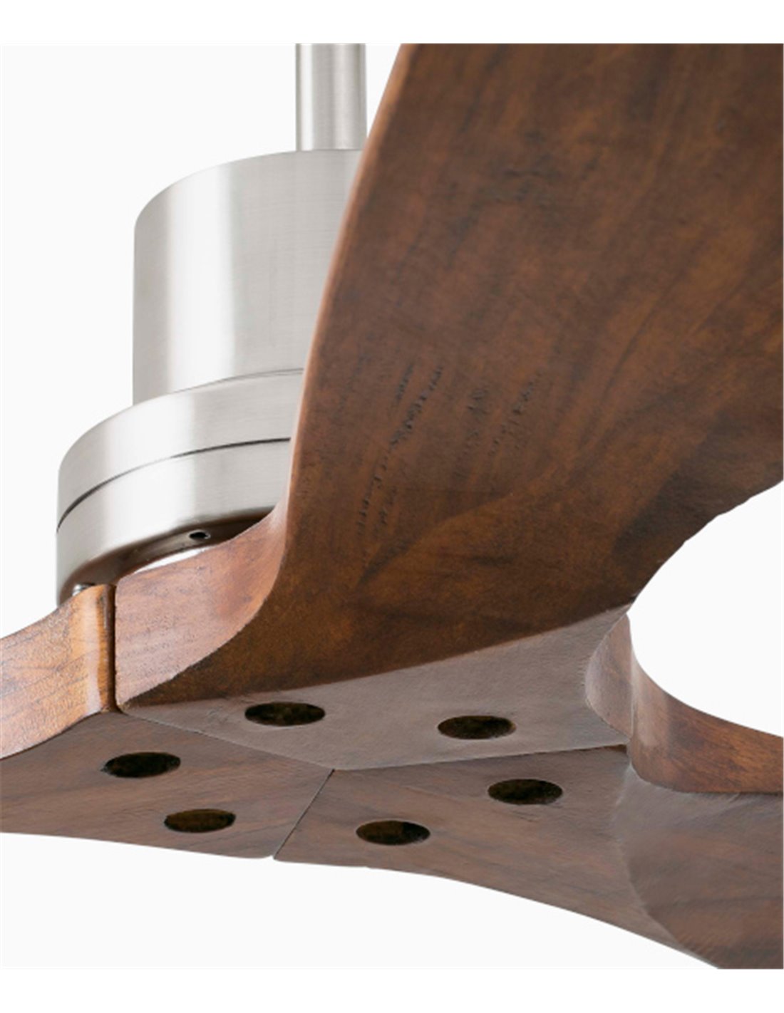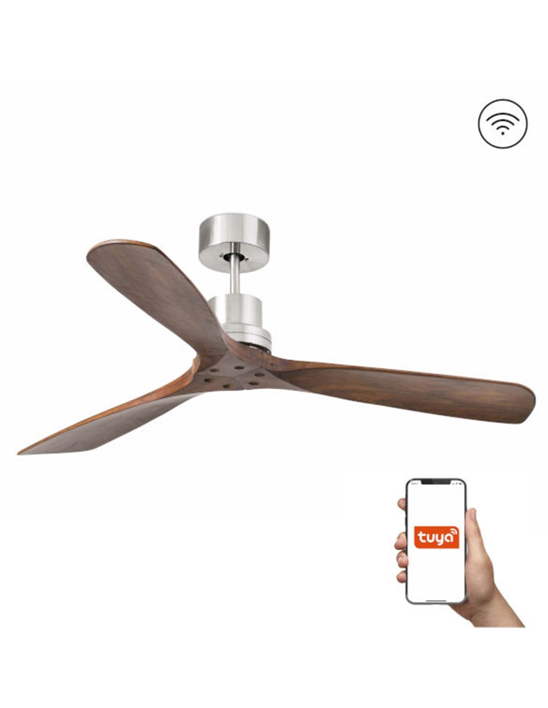 About Faro's Lantau ceiling fan without light; ultra-quiet DC motor, walnut wood blades, TUYA smart system, reverse function