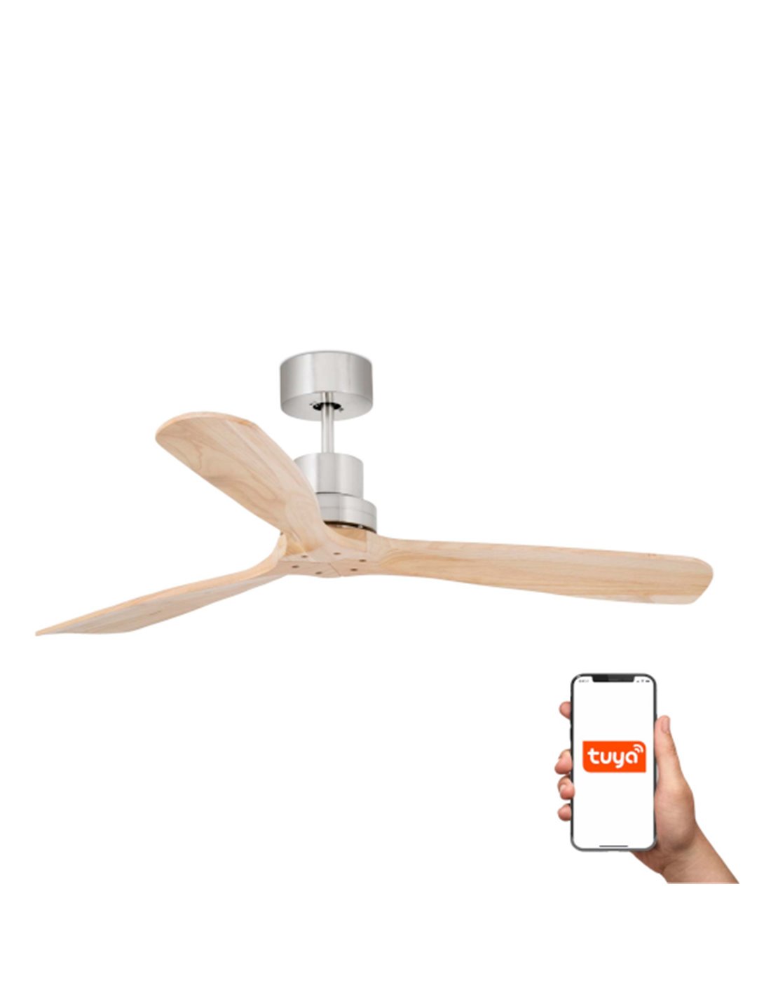 About Faro's Lantau ceiling fan without light; efficient and quiet DC motor, pine blades, intelligent TUYA control, diameter 132 cm, reverse function, suitable for sloped ceilings
