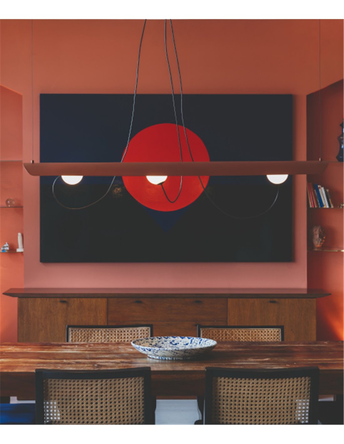 This linear pendant light stands out for its innovative acoustic design, which plays with the relationship between the metal shade and the glossy opal blown glass globes. The three globes slide slightly over the fabric-covered shade, as each incorporates an internal neodymium spherical magnet that creates a subtle, precise magnetic field, allowing gentle movement while holding them securely in place.