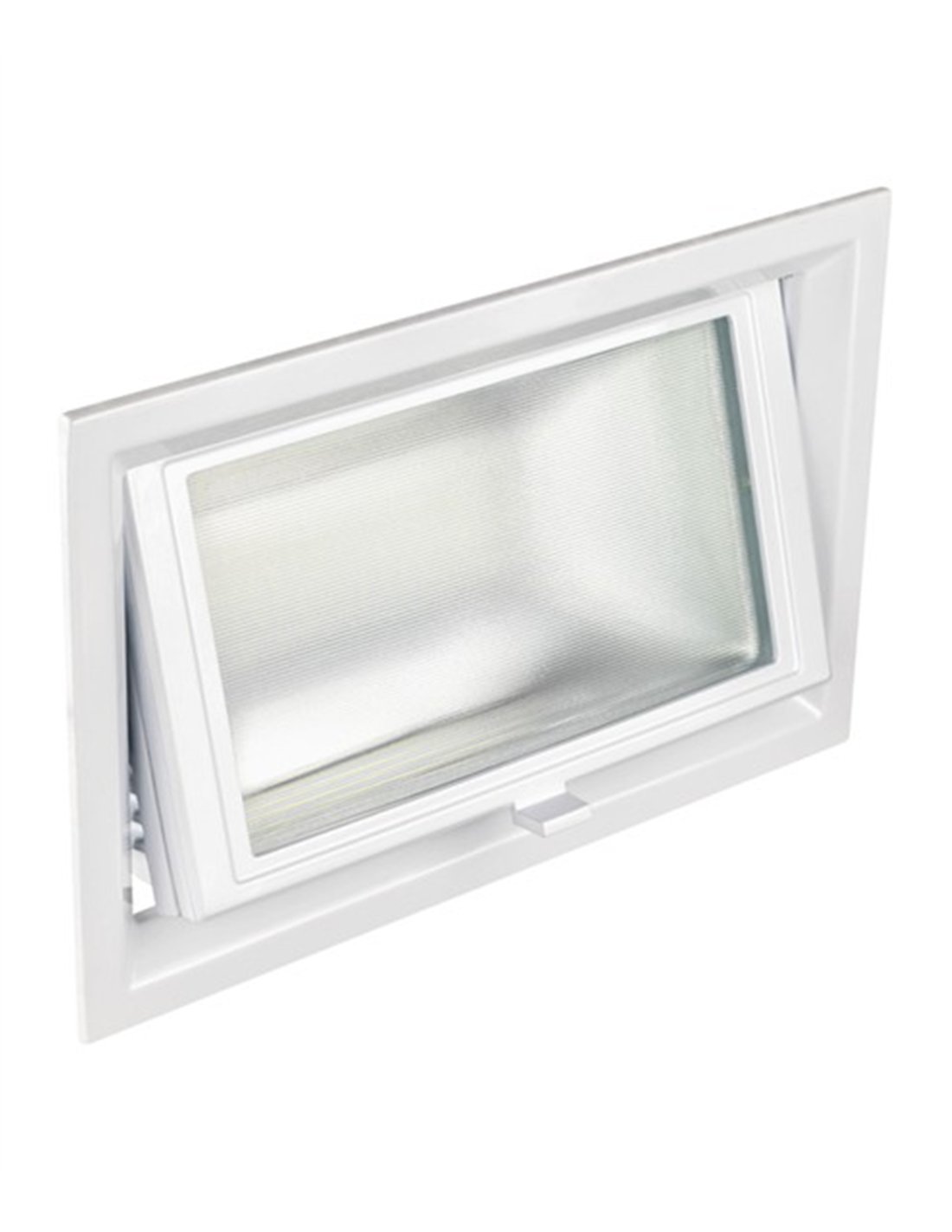 Adjustable LED downlight model 5076, IP40 rated, 30 W power. Available in several colour temperatures: 3000 K (warm light), 4000 K (neutral light) and 6000 K (cool light). Luminous flux: 2300 lm. Beam angle: 80°. Size: 241 x 154 x 95 mm. Cut-out: 220 x 132 mm. Weight: 1380 g. Made of aluminium, iron and glass. The spotlight tilts up to 55°. Available in white, black and silver finishes.