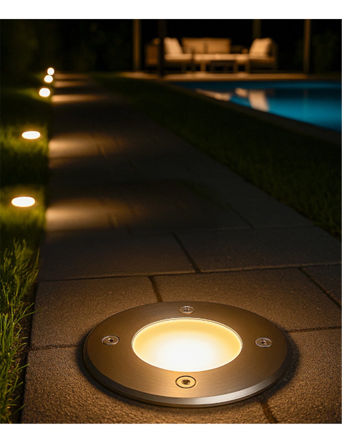 Recessed ground spotlight model CRACOV in aluminium finish. It features IP67 protection and IK10 impact resistance.