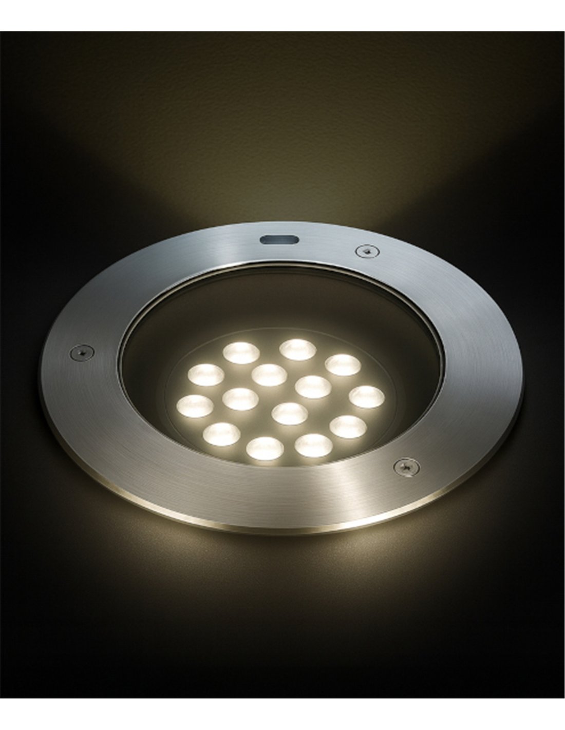 Adjustable recessed floor spotlight model KIEV1 in aluminium and sandblasted black finish. Features IP67 protection and IK08 impact resistance. Offers a colour temperature of 3000 K (warm light), with adjustable spotlight depth and anti-glare lighting.