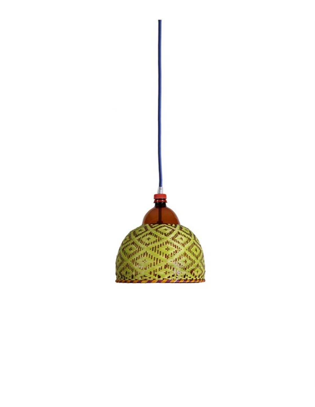 This pendant light is crafted from reused PET bottles and natural paja tetera fibers. Its predominant green tone adds a sense of freshness while highlighting the handwoven texture characteristic of the collection.