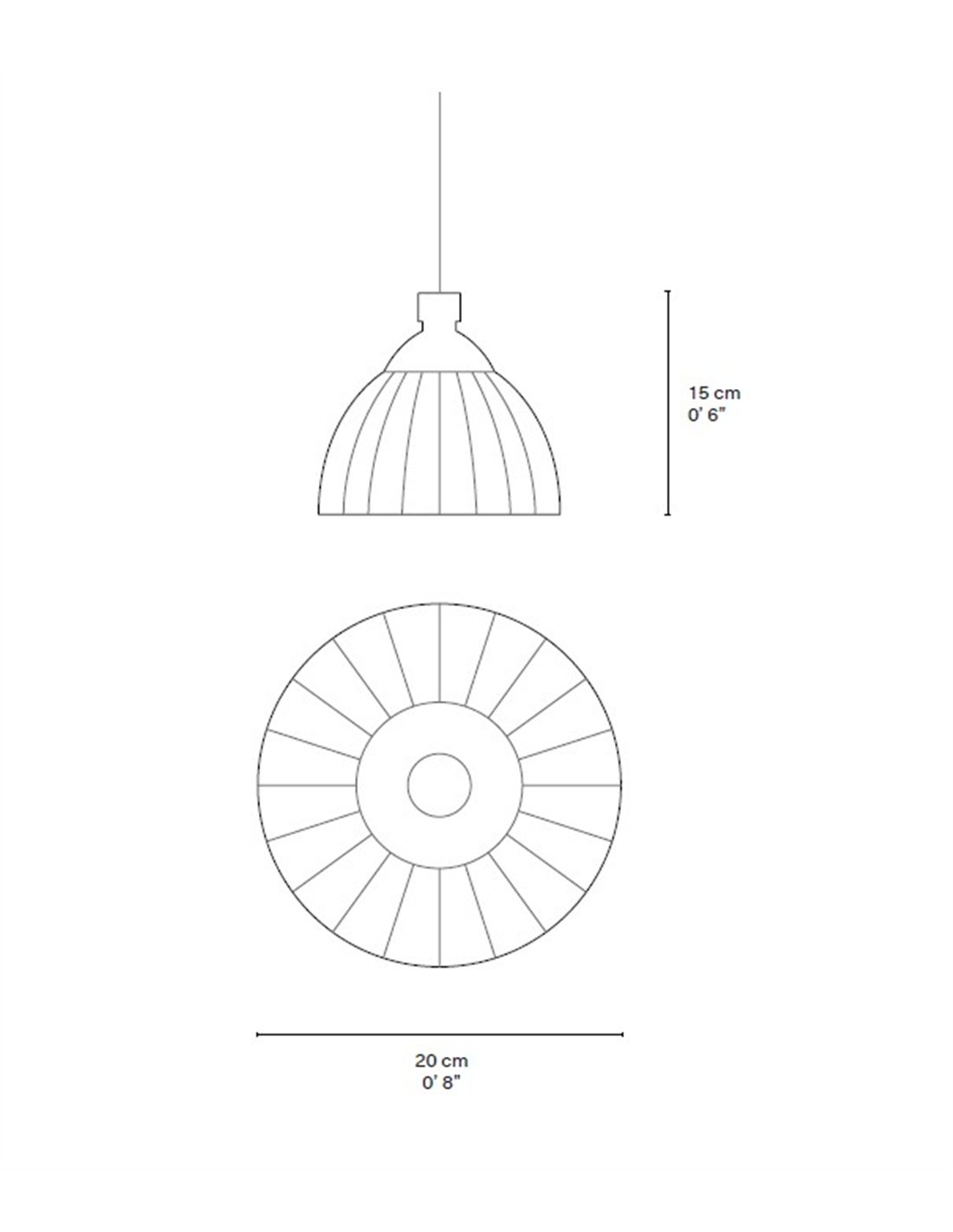 It measures 20 cm in diameter and 15 cm in shade height, and includes a 150 cm textile cable that allows for adjustable installation according to ceiling height. It comes with an E14 LED bulb, 4W (400 lumens, 2700K), providing a warm and gentle light.