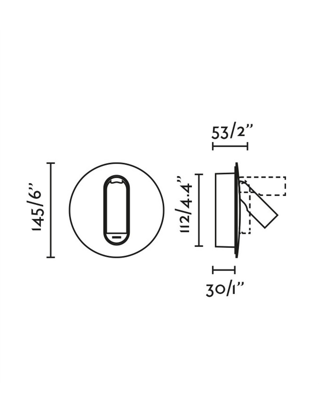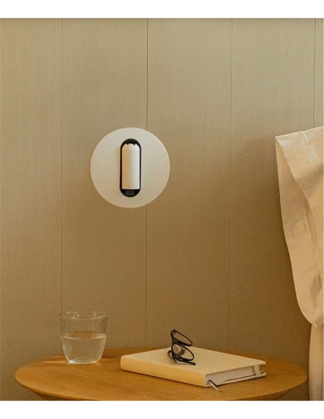 Timit is a minimalist wall light that stands out for its rounded base, designed to soften spaces dominated by straight lines. It is available in white or black and can be installed either recessed or surface-mounted, both options included under a single reference.