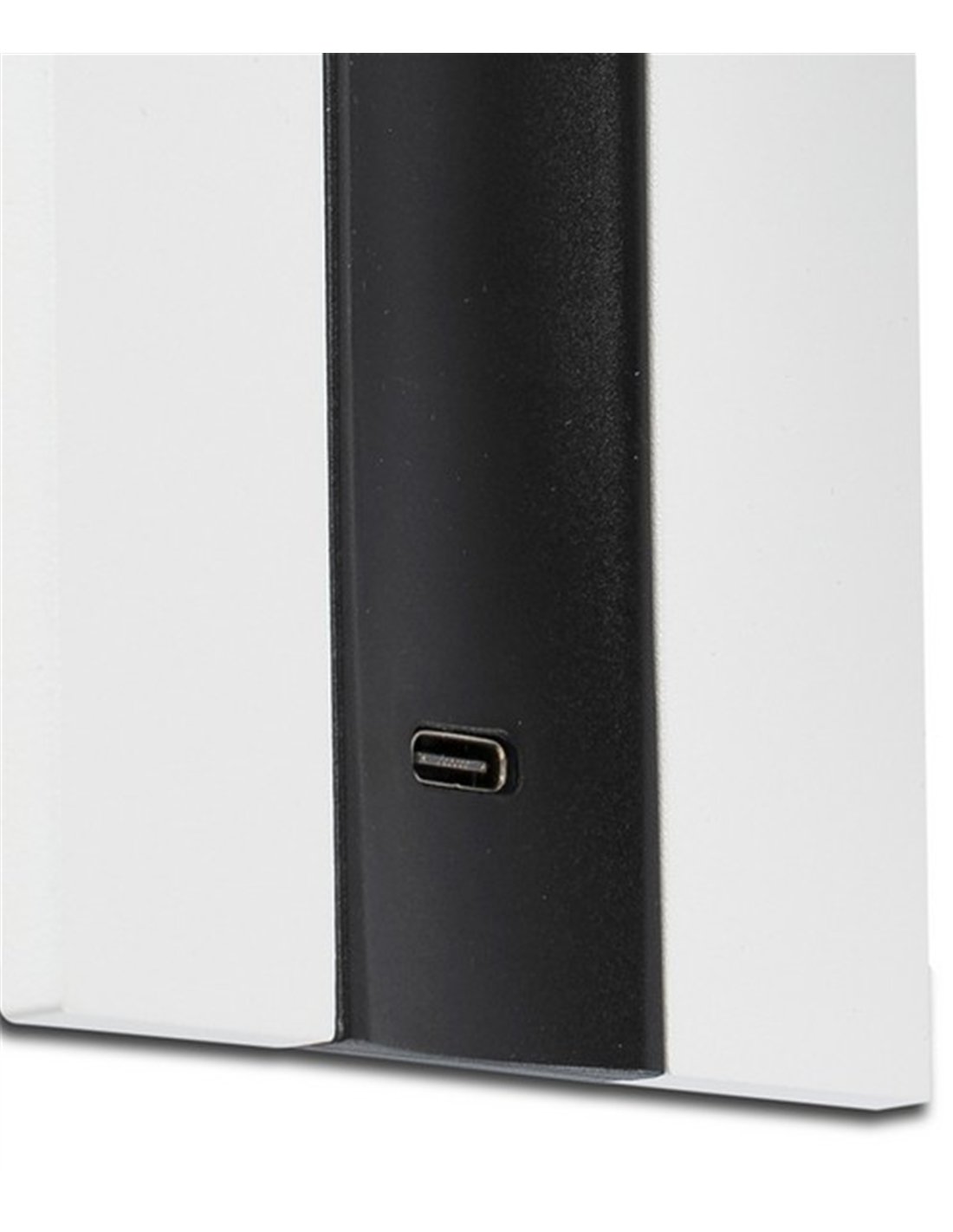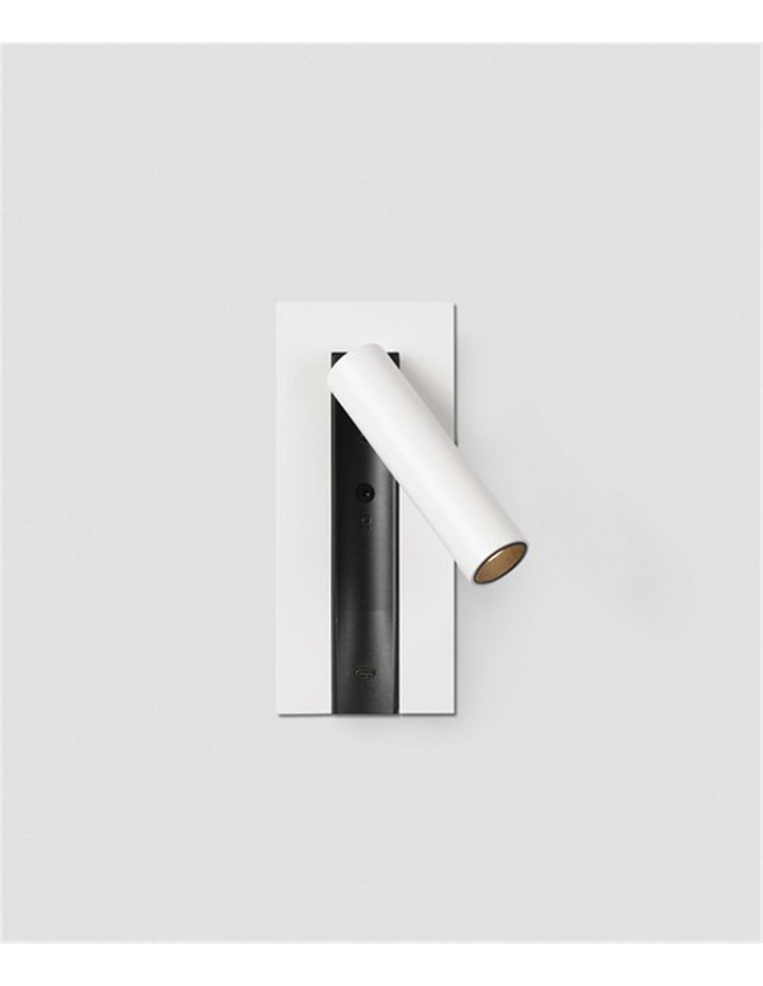 The Gabo wall light stands out for its minimalist design, available in matte white, black or bronze. Its structure integrates a frame with a cradle-shaped central trim that conceals both the reading light and the USB-C port, maintaining a clean and elegant appearance.