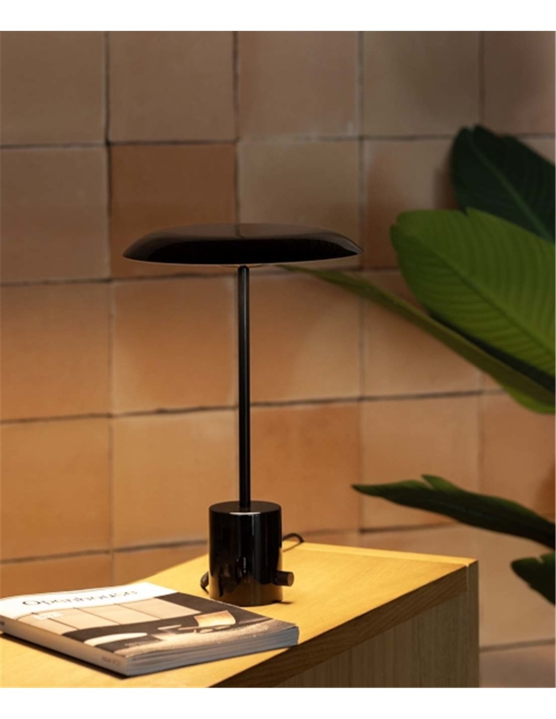 The Hoshi table lamp, designed by xJeR Studio, features a solid cylindrical base that provides stability and a slender body topped with a flat shade. Its glossy finish in black, red or blue allows it to blend seamlessly into contemporary interiors.