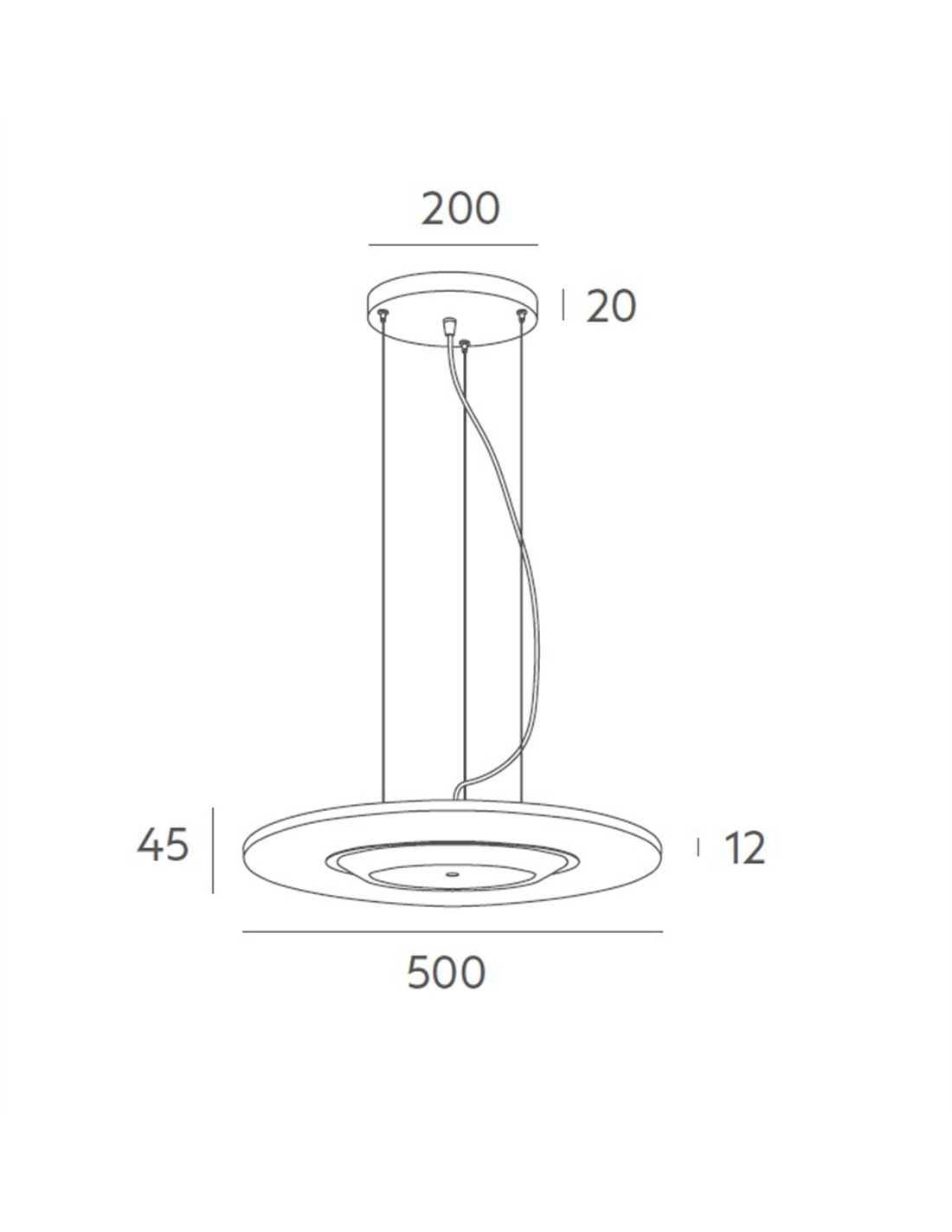 Its round shade is available in four diameters: 50, 60, 70 and 80 cm. The light source is the same for all sizes: an integrated 19W LED with 1500 lumens and 3000K, providing warm and uniform illumination.