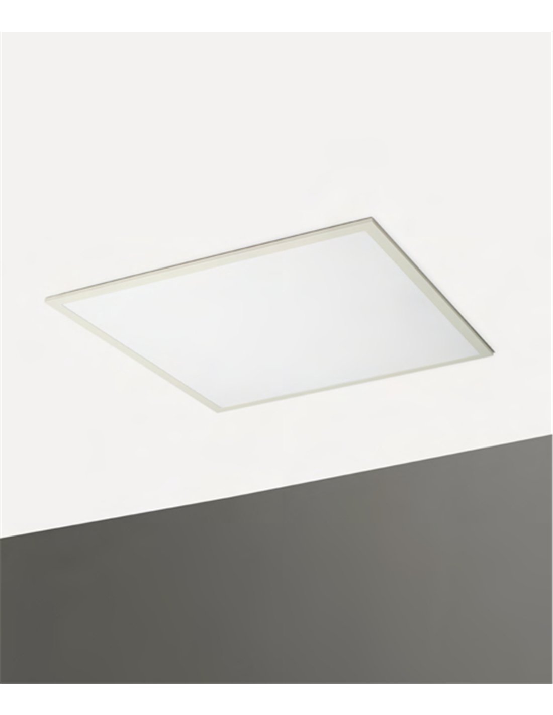 Its white structure measures 59.6 × 59.6 cm and only 3 cm in height, making it perfect for suspended ceilings with limited space or projects seeking a clean, discreet aesthetic. It integrates a 30W LED light source delivering 3,600 lumens. As a guideline, a panel of these characteristics can cover between 10 and 18 m², depending on ceiling height and space conditions; for larger areas, multiple units can be installed.