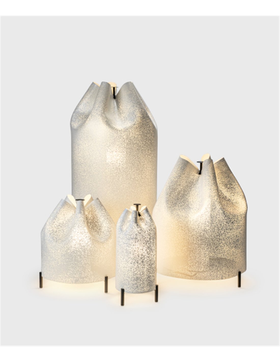 Agasallo is a decorative floor lamp made of stainless steel mesh, available in white, beige, grey, taupe or black. The mesh allows part of the light to pass through, creating a soft illumination that is well suited to generating ambience and complementing general lighting.