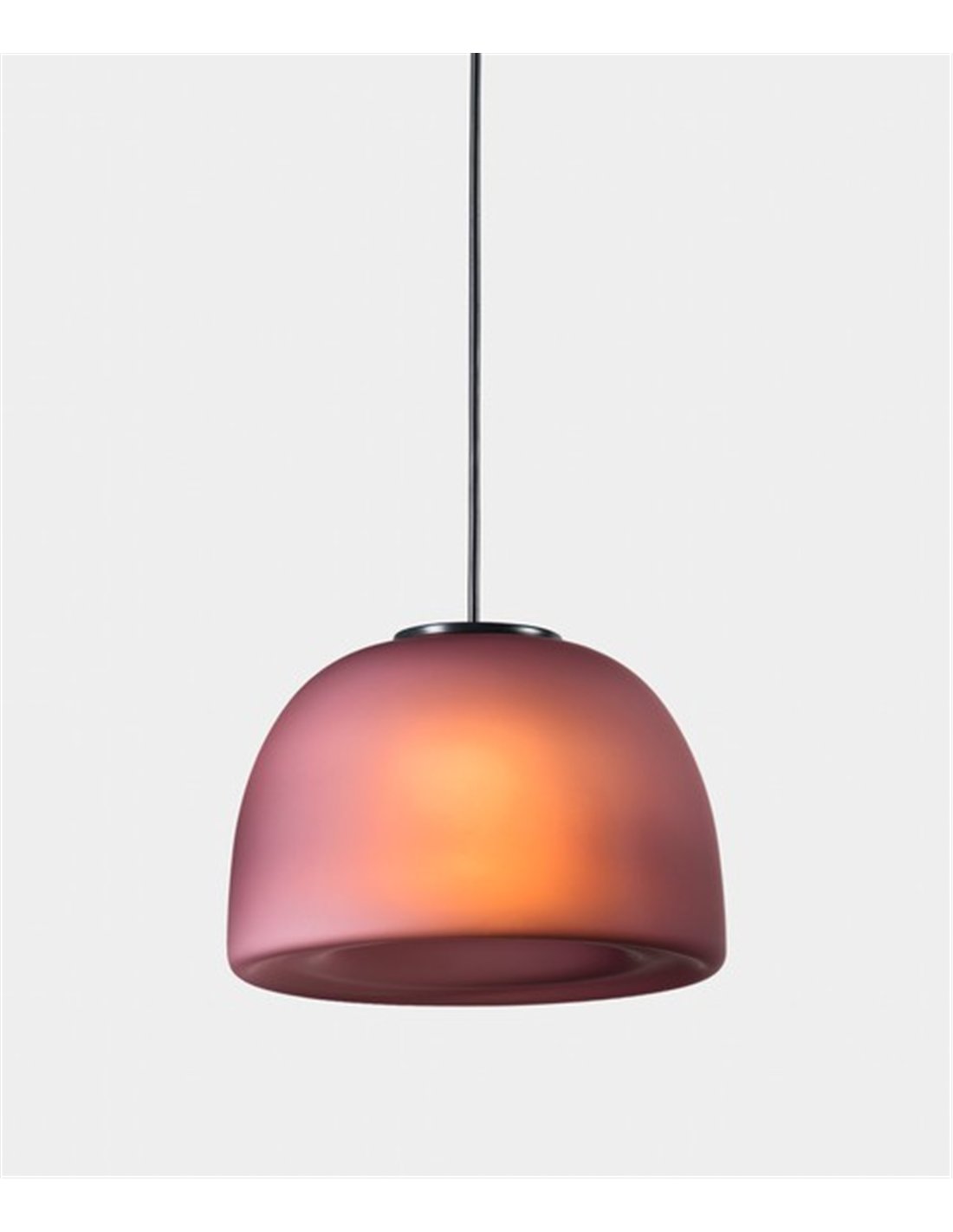 Veiga is a pendant lamp with a semi-oval coloured glass shade. It is available in white, cream, grey and amethyst (purple). The flared shape and the lower cavity with a wavy relief help to control glare and concentrate the light output downwards, creating a defined light point with a soft halo around it.
