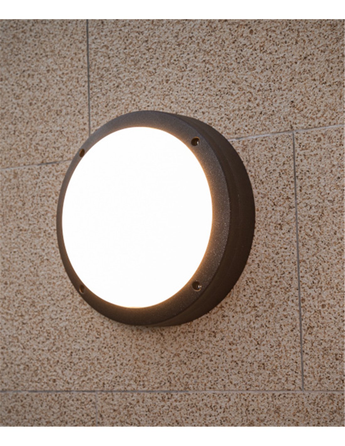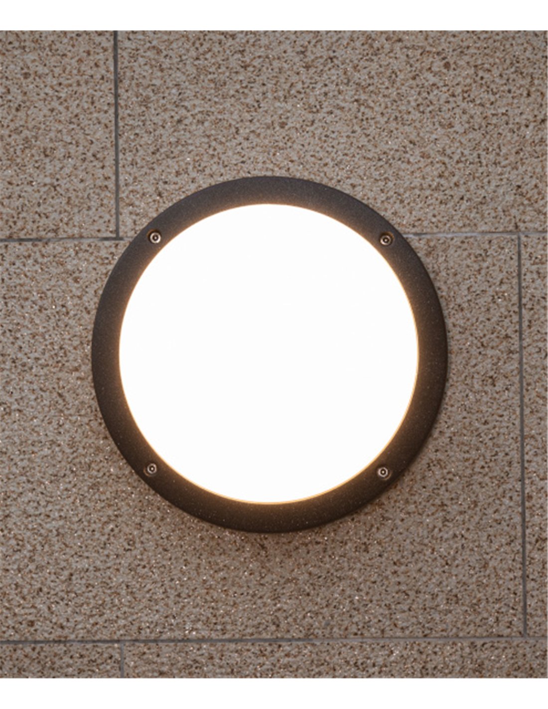 Nador is an outdoor wall light with a circular shape, 27 cm in diameter and finished in anthracite. The body is made of die-cast aluminium and incorporates an opal PC diffuser, which helps distribute the light evenly and reduce glare.