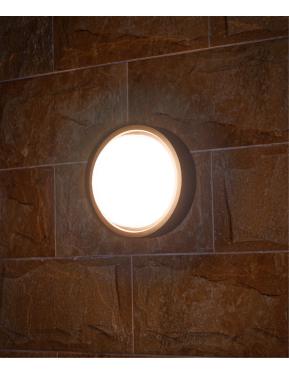 This is a clean, circular outdoor wall light measuring 24 cm in diameter, designed for ambient façade lighting. The body is made of die-cast aluminium and the diffuser is opal PC, creating a soft halo of light on the wall. The anthracite finish helps it blend into contemporary architecture. Its IP65 rating allows installation in outdoor environments.
