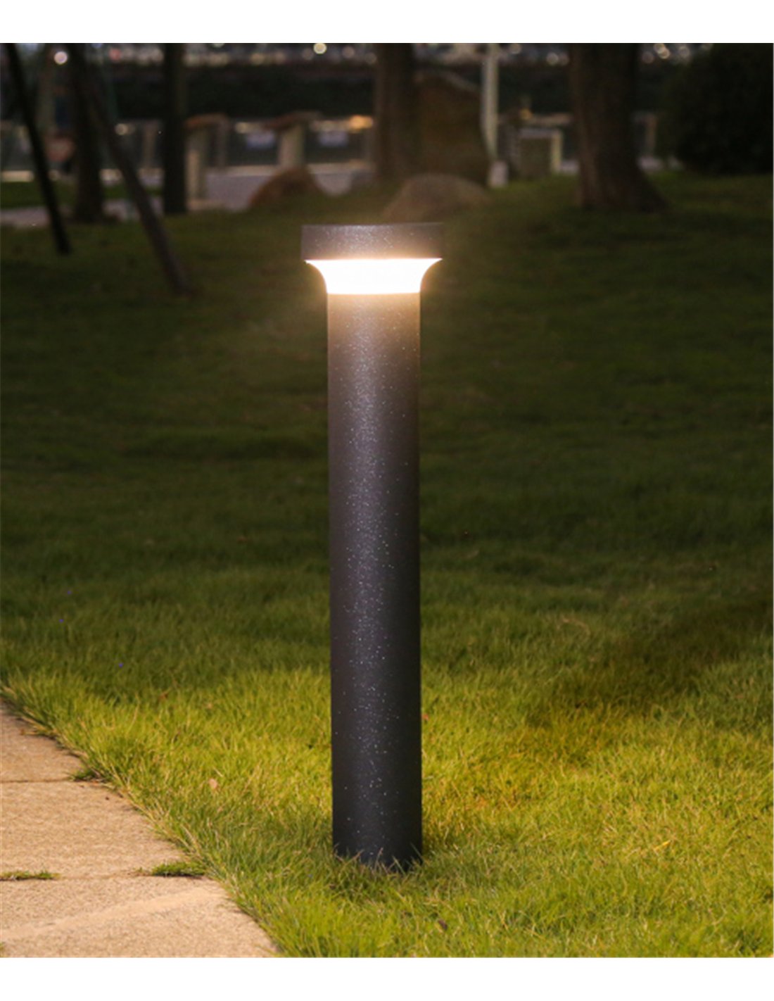 This is an outdoor bollard light with integrated LED, designed to mark pathways and provide orientation lighting in gardens. The body is made of die-cast aluminium and the diffuser is opal PC, which helps soften the light output. It includes pre-wiring and IP65 protection for outdoor use.