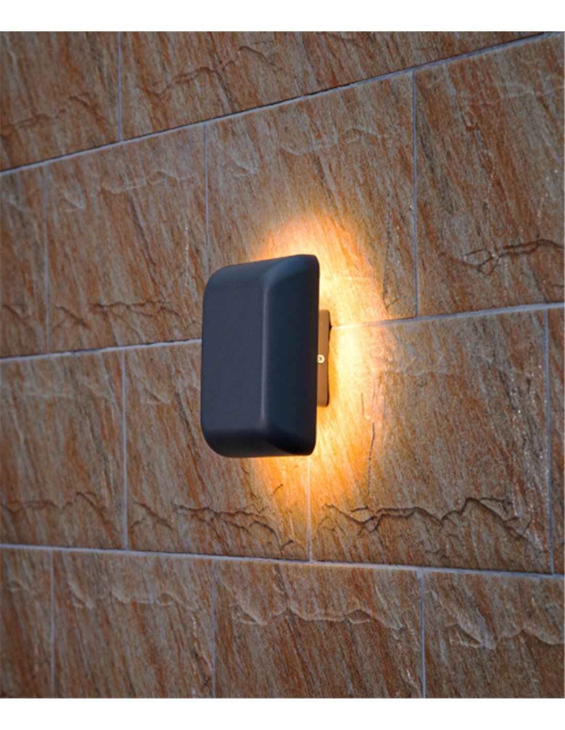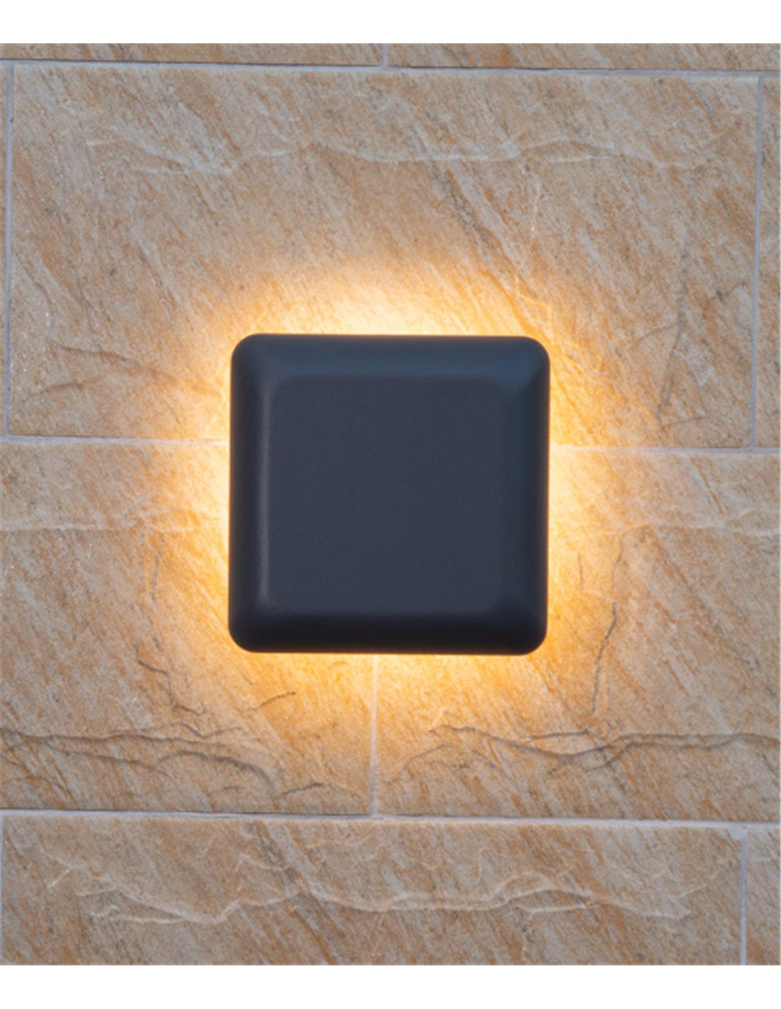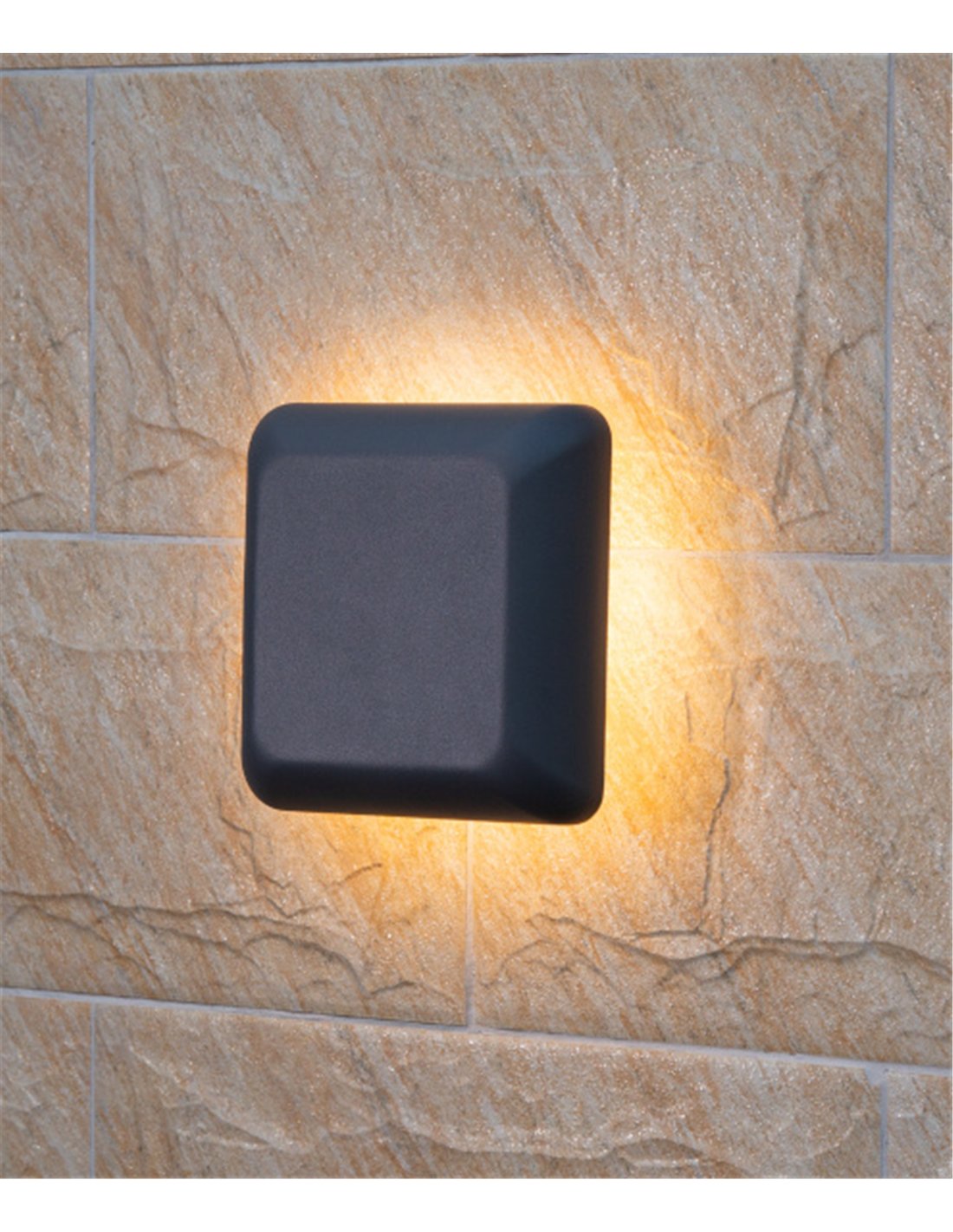 Ova is an outdoor wall light in a square 19 × 19 cm format, designed to provide indirect ambient lighting. Its structure has a geometric volume with an anthracite finish, creating a perimeter halo effect around the piece by projecting the light onto the wall.
