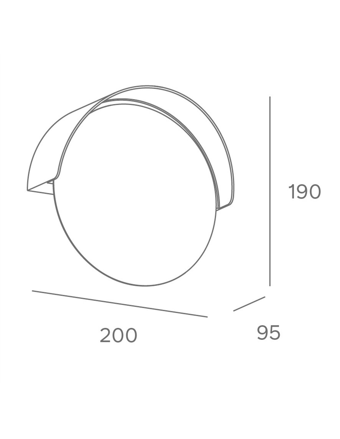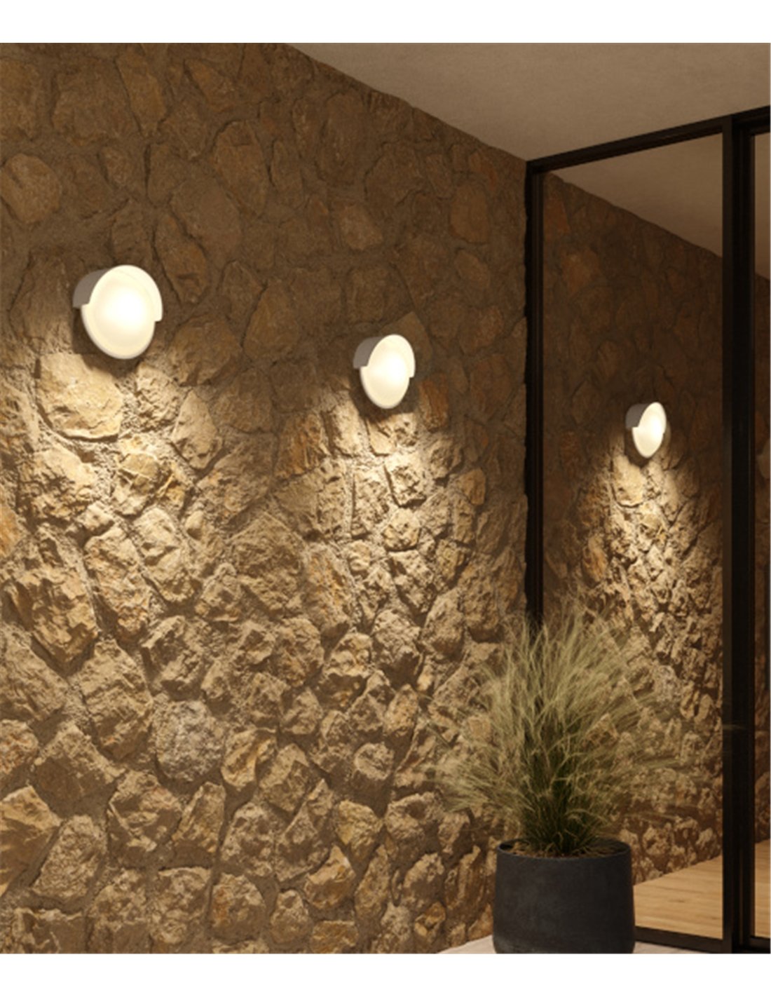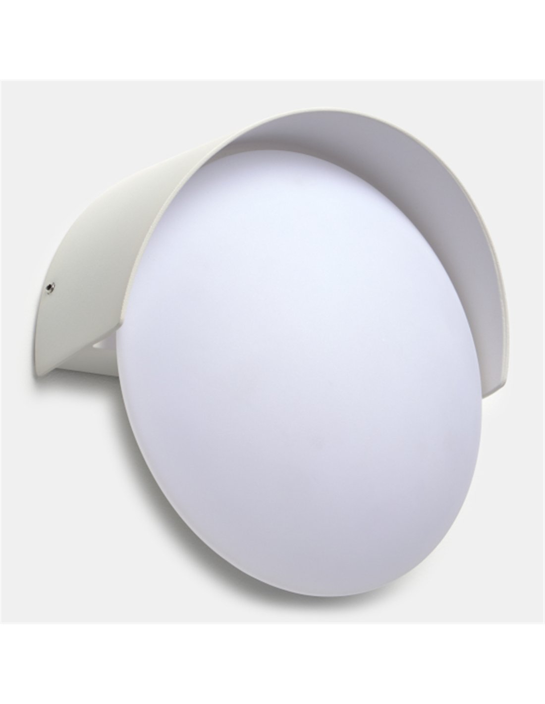 This outdoor wall light stands out for its modern aesthetic, with an opal front diffuser and an upper visor that shields the light from direct view. The design combines a rounded body with a curved cover, available in white or black.