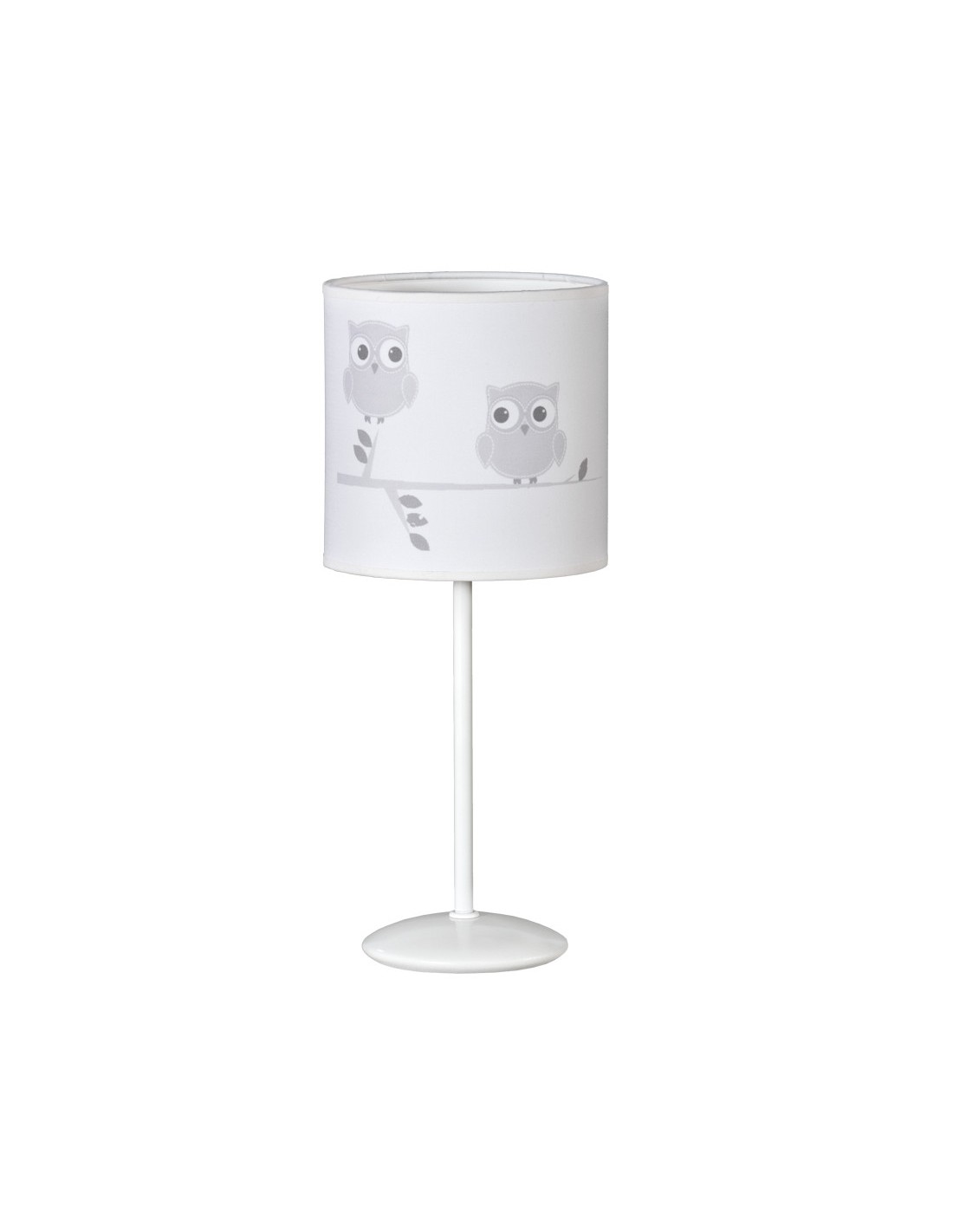Children's bedside table lamp from the Owls family. Measuring 14x34 cm and 34 cm high, its lampshade created with textile and PVC has an owl print in gray. It uses a bulb E-27 26W max (not included). The same luminaire is also available in a pendant lamp version.