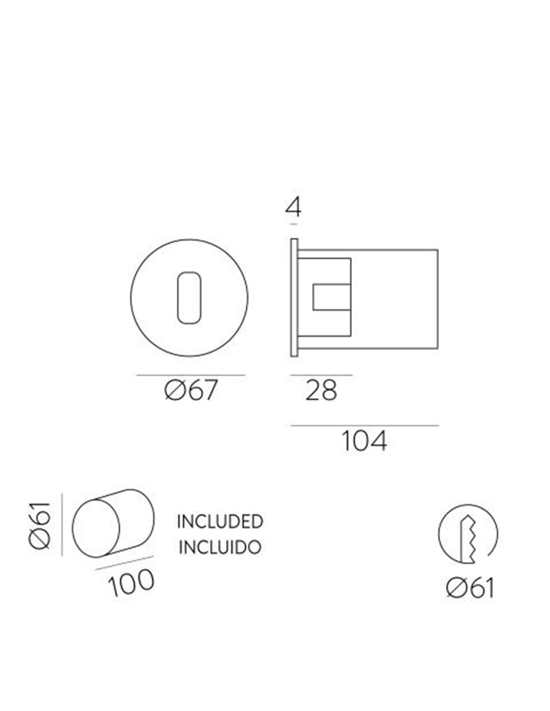 This wall-recessed spotlight measures 2.8 cm in length and 6.7 cm in diameter, with a weight of 0.2 kg. It requires a cut-out hole of 6.1 cm in diameter and 7 cm in depth for wall installation.