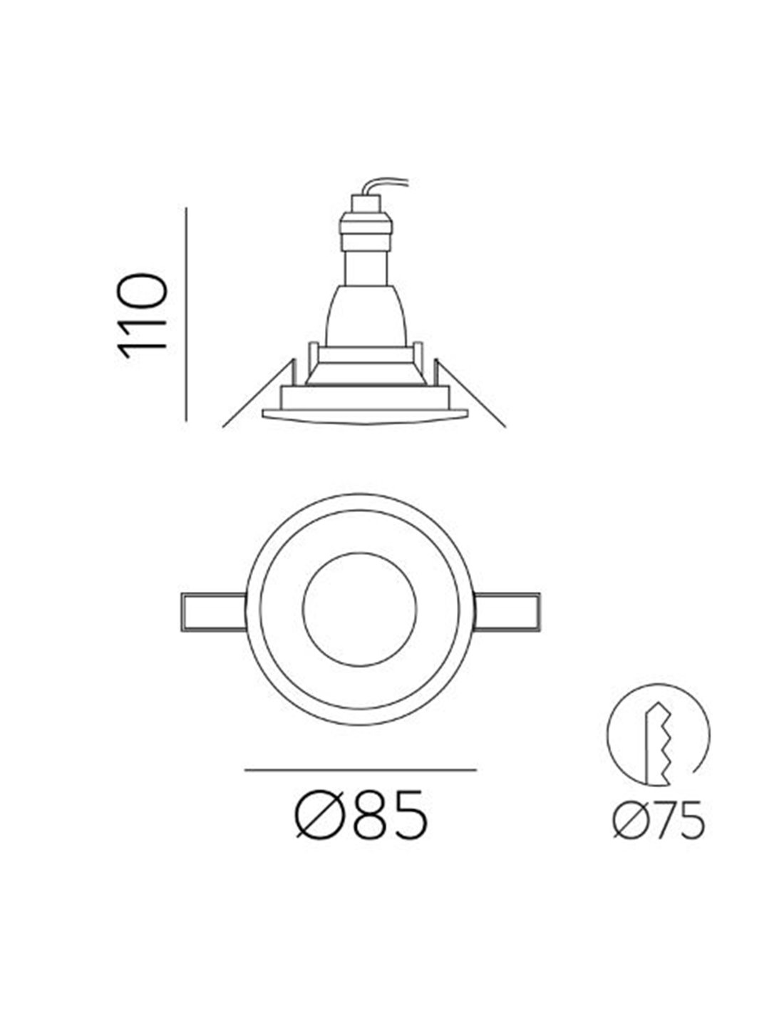 Its diameter measures 8.5 cm and the total depth is 11 cm. Its light source is 1xGU10 LED, bulb not included.