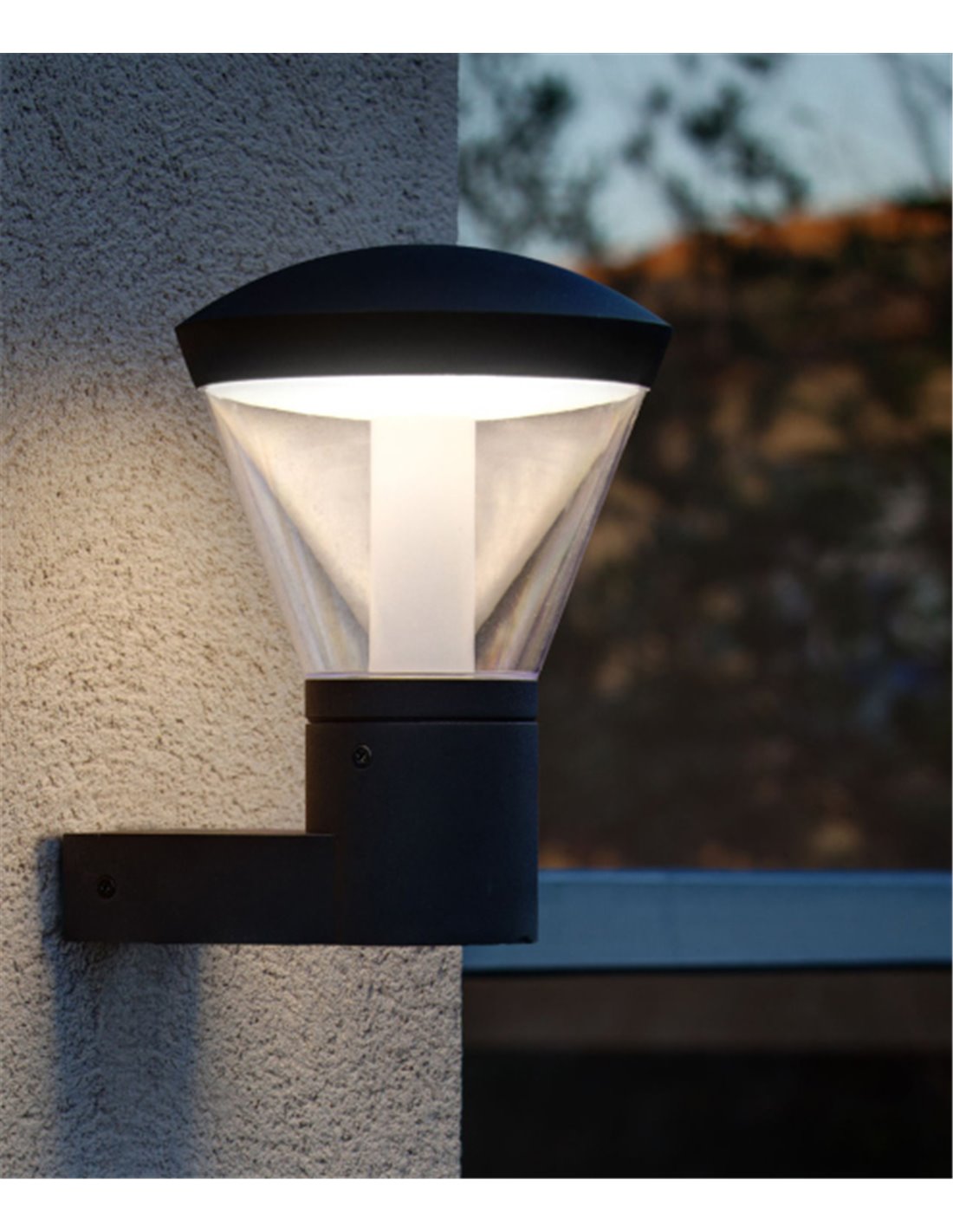 Shelby is a set of lamps created by Conillas for outdoor lighting, characterised by the use of LED technology and a wide diffuser that distributes the light evenly, providing efficient and elegant illumination. The light source of the wall lamp is a 10W SMD LED, which emits 600 lumens of warm light with a colour temperature of 3000K, and is integrated into the lamp.
