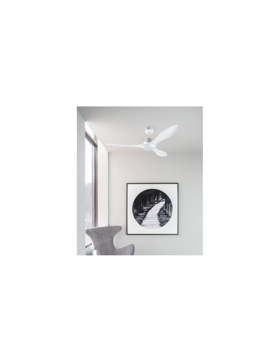 Polaris is a ceiling fan with LED light from Faro. This white model with modern lines features a DC motor, which ensures energy savings of almost 70% compared to conventional fans.
