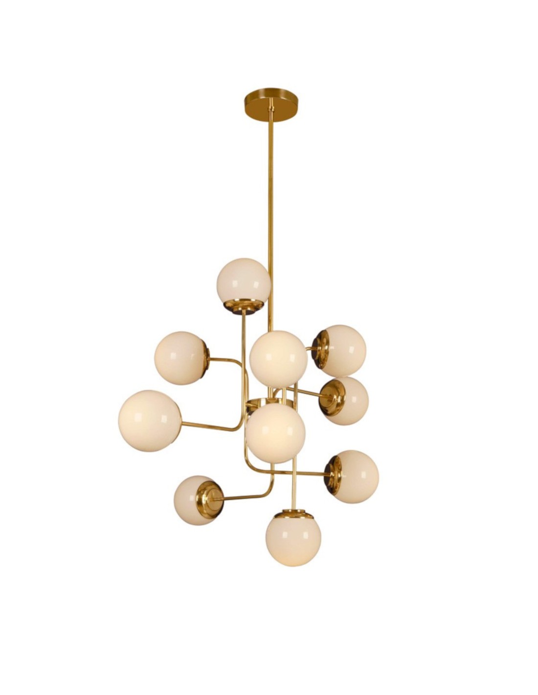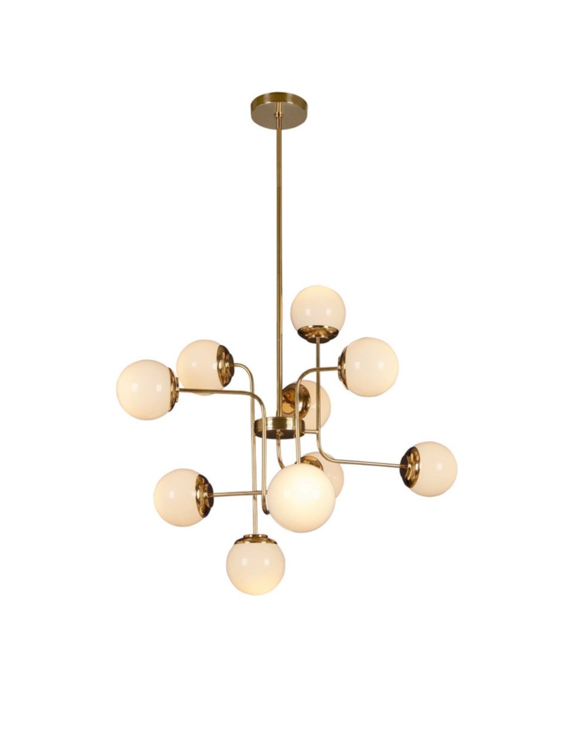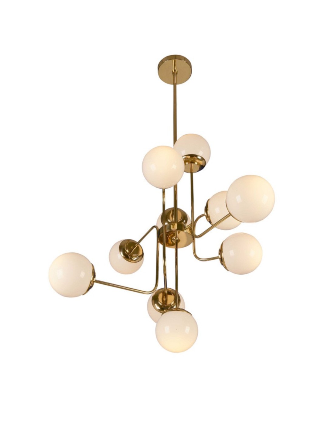The Fairmont ceiling light is part of a collection of luminaires made with high-quality materials: a main brass structure with double-layer glass shades. It features 10 interlaced arms that create a balanced composition and distribute the light in all directions.