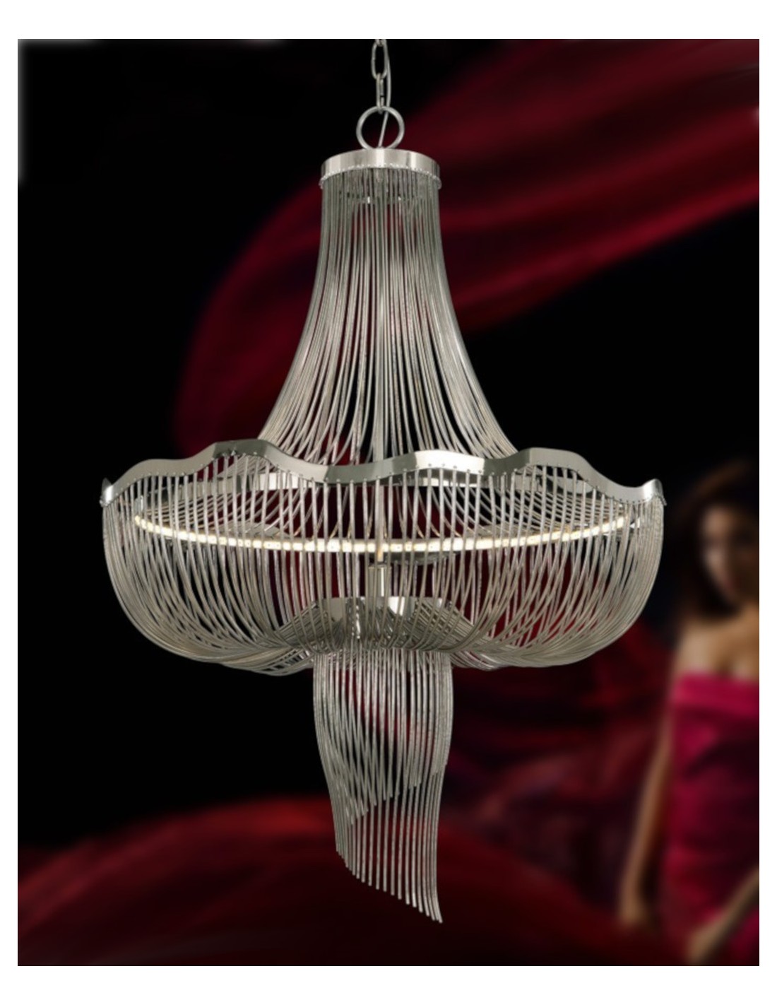 Medussa combines a structure made of fine steel rods that evoke the organic movement of a jellyfish, offering a light and contemporary visual presence. Its sculptural design is intended to stand out in spacious interiors.