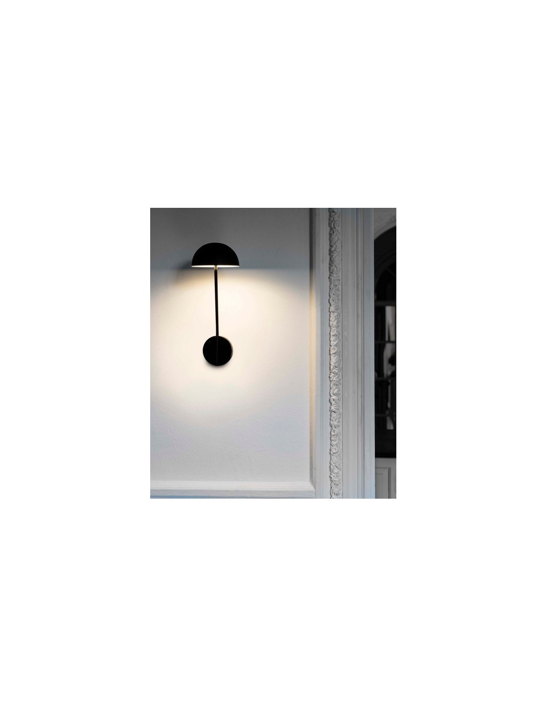 Pure is a wall light designed by Nahtrang, featuring a minimalist aesthetic and soft lines. Its matte black steel structure combines a round backplate with a slim arm and a rounded head that integrates the light source. The transparent PMMA diffuser distributes the light evenly, creating a warm, discreet wall-wash effect.